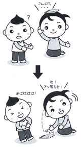次に何かを頭の上に乗せ、「こんにちは」と頭を下げ、頭のものを落とすのです。